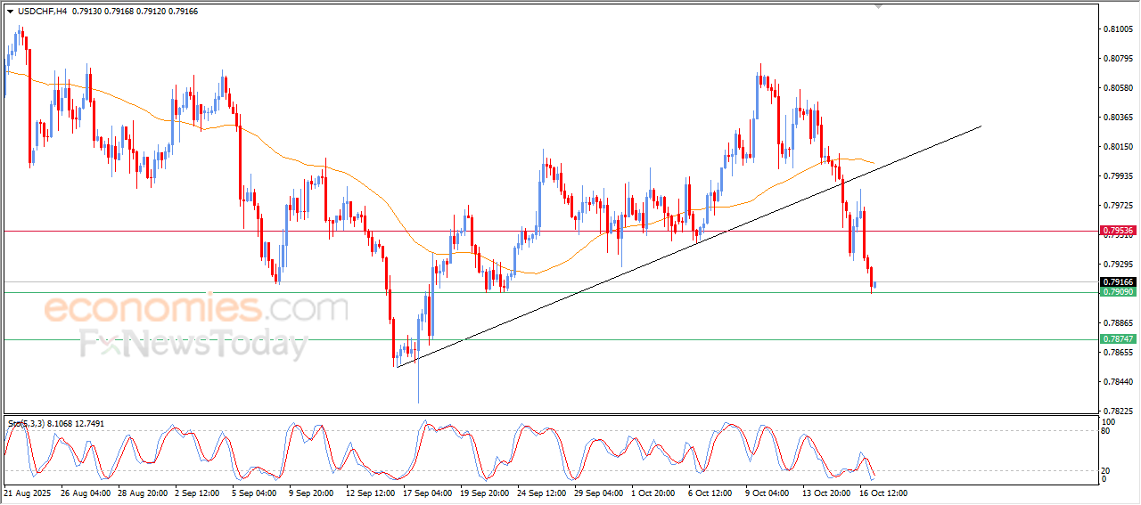 The (USDCHF) price settled with sharp losses in its last intraday trading, leaning on key support level at 0.7905, this support was our expected target in our previous analysis, amid the dominance of steep short-term bearish sub-wave, with the continuation of the negative pressure due to its trading below EMA50, on the other hand, we notice the beginning of positive overlapping signals appearance on the relative strength indicators, after reaching oversold levels, which might reduce its upcoming losses and it might create intraday corrective rebounds.