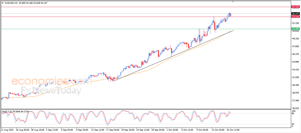 The (silver) price returned to rise in its last intraday trading, amid the dominance of the main bullish trend on the short-term basis and its trading alongside supportive trend line for the stability of this track, amid the continuation of the positive pressure due to its trading above EMA50, on the other hand, we notice the emergence of negative overlapping signals on the relative strength indicators, after reaching overbought levels, which might reduce the upcoming gains.