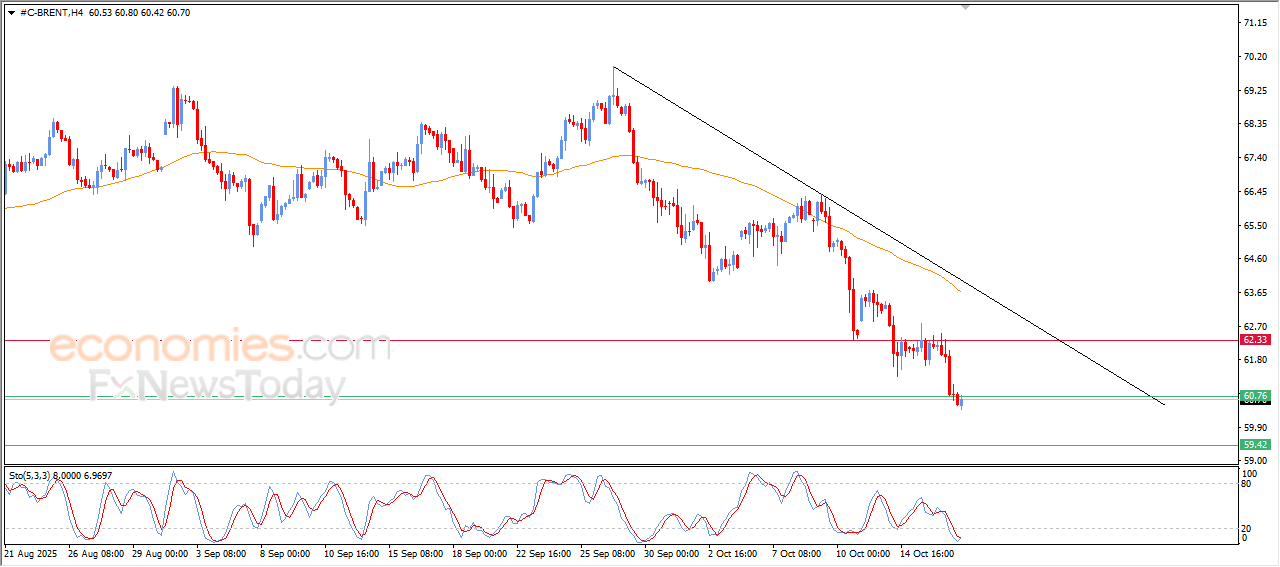 The (Brent) price settled with sharp decline in its last intraday trading, to reach $60.75, which represents our expected target in our previous analysis, amid the continuation of the negative pressure due to its trading below EMA50, and under the dominance of the main bearish trend on the short-term basis and its trading alongside trendline, besides the emergence of the negative signs on the relative strength indicators, despite reaching oversold levels.