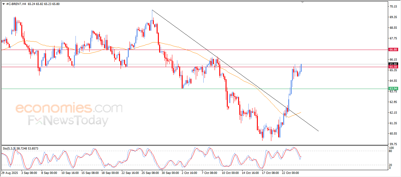 Brent crude oil prices rose in their last intraday trading, with the beginning of forming positive divergence on the relative strength indicators, after reaching exaggerated oversold levels, compared to the price move, with the emergence of positive crossover, amid the dominance of steep bullish corrective wave, indicating the strength of this track, to breach the current resistance level at $65.55.