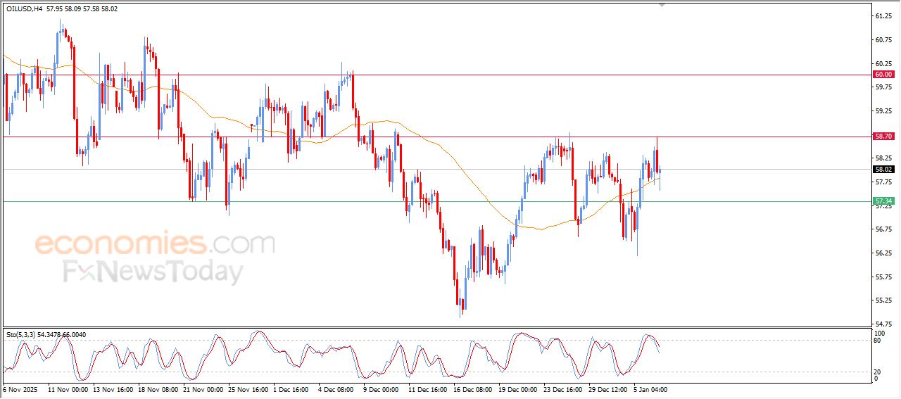 The (crude oil) price rose in fluctuated trading on its last intraday levels, after reaching $58.70 resistance, which represents our expected target previously, attempting to gain bullish momentum to help it breach this resistance, leaning on EMA50’s support, gaining bullish momentum that help it to rebound quickly amid the dominance of the bullish corrective trend on the short-term basis.