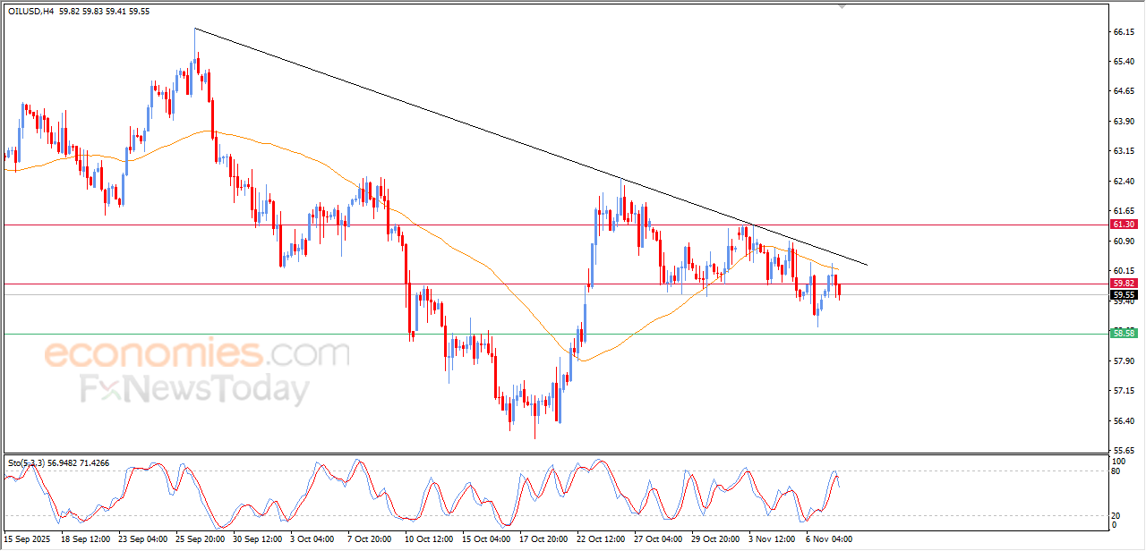 The (crude oil) declined in its last intraday trading, affected by reaching the resistance of the EMA50, which put it under negative pressure with the beginning of forming negative divergence on the relative strength indicators, after reaching overbought levels, exaggeratedly compared to the price move, with the emergence of the negative signals.