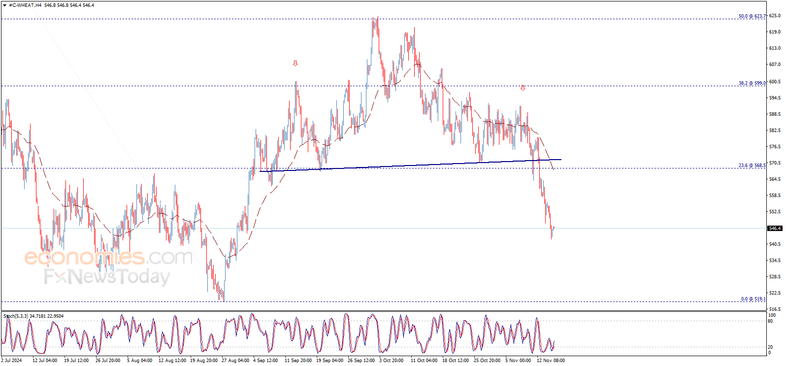 Wheat price shows more decline to reach 540.00$ areas, affected by the head and shoulders’ pattern that appear on the chart, which supports the chances of continuing the bearish trend to achieve negative targets that reach 519.10$.