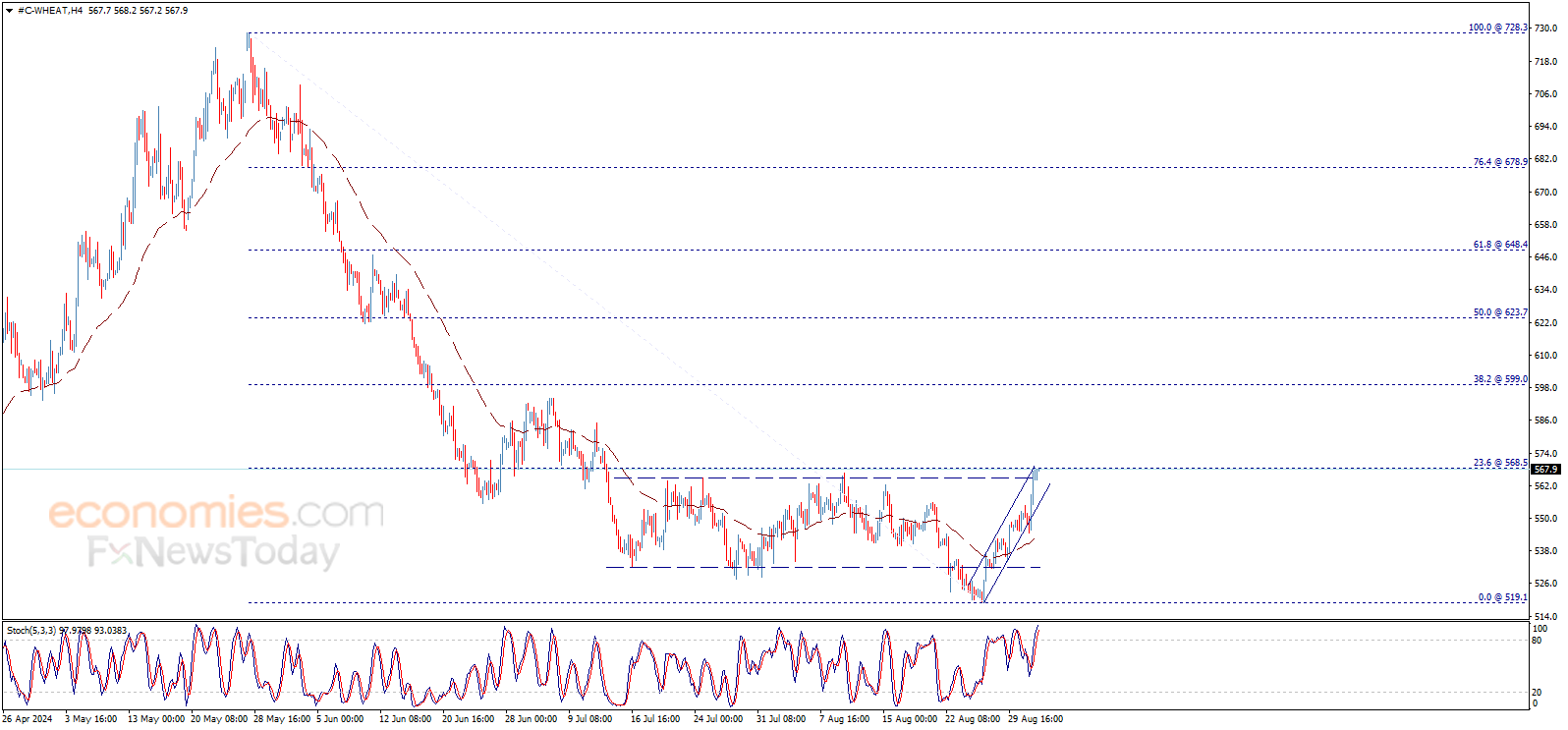 Wheat price rallied upwards to succeed achieving our waited target at 564.60$, and surpassed this level to open the way to achieve bullish correction for the decline that started from 728.30$ areas, noting that breaching 568.50$ will push the price to head towards 599.00$ areas as a next main station.