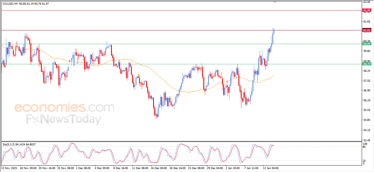 The (crude oil) price soared high in its last intraday trading, reaching $61.00 resistance, which represents our expected target in our previous analysis, taking advantage of the dynamic support that is represented by its trading above EMA50, under the dominance of minor bullish wave on the short-term basis, despite the emergence of negative overlapping signals on the relative strength indicators, after reaching overbought levels, indicating the volume and strength of the bullish momentum.