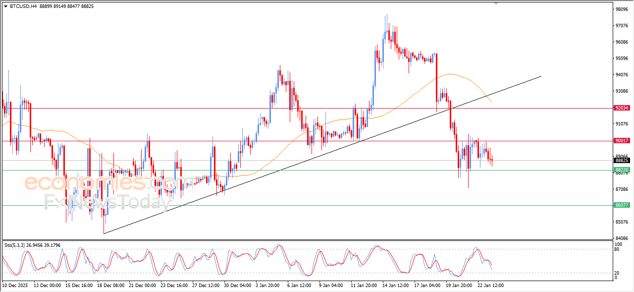 The (BTCUSD) price declined in its last intraday trading, amid the emergence of negative signals from relative strength indicators, amid the continuation of negative pressure due to its trading below EMA50, affected by breaking main bullish trend line on short-term basis previously, these signals may extend the pressure on the price on the intraday basis.