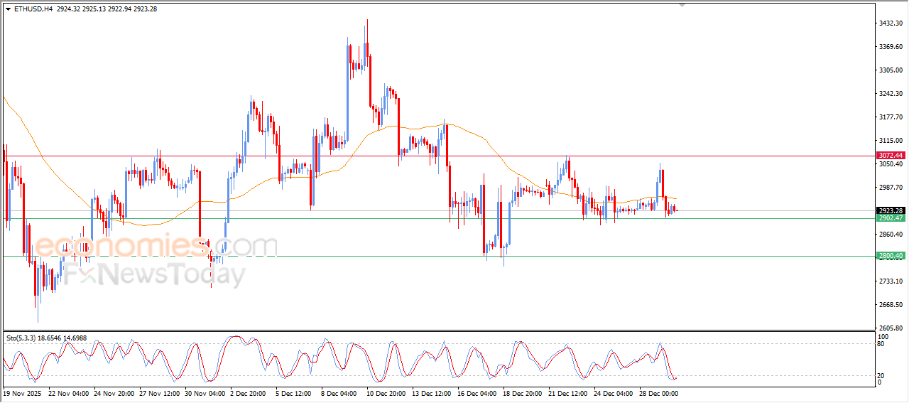 The (ETHUSD) price declined in its last intraday trading, after witnessing fluctuating trading yesterday to settle below EMA50, forming dynamic negative pressure that reinforces the chances of deepening the losses in the upcoming period, especially when breaking$2,900 key support, on the other hand, we notice the emergence of positive overlapping signals on the relative strength indicators, after reaching oversold levels, forming a factor to help the price reverse these expectations by a sudden rise.
