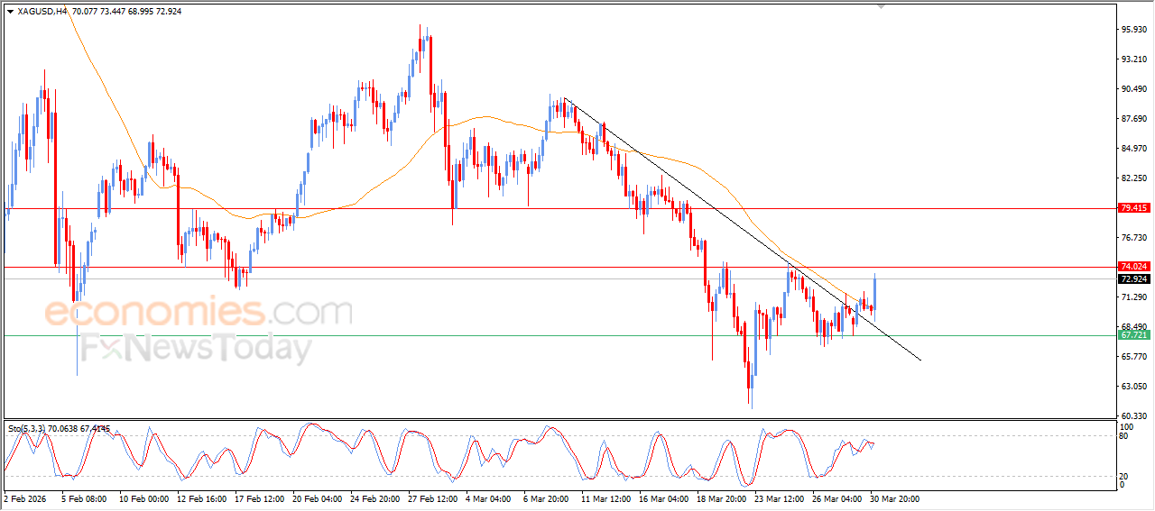 Silver surged higher during recent intraday trading, benefiting from breaking a short-term descending trendline, which boosted positive momentum. The price also managed to overcome the negative pressure from EMA50, signaling a partial recovery and now moving toward testing the key resistance level at $74.00.