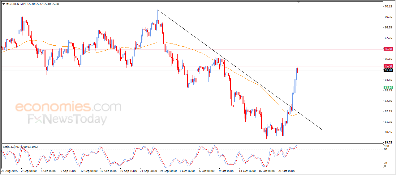 Brent crude oil prices declined in their last trading on the intraday levels, in a truce to catch breath and a quick profits-taking before resuming its strong gains, and attempts to offload some of its overbought conditions on the relative strength indicators, amid the dominance of steep bullish corrective wave that indicates the strength of this track, besides the continuation of the positive pressure that comes from its trading above EMA50, reinforcing the chances of extending its gains on the near-term basis.