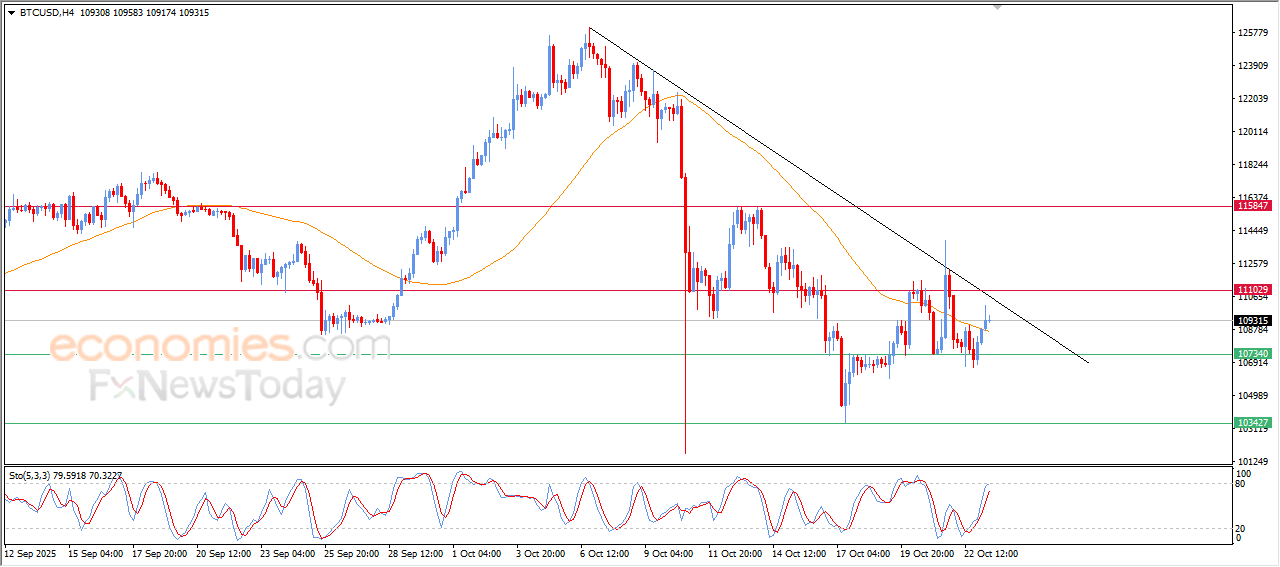Bitcoin (BTCUSD) prices settled with cautious gains during their last intraday trading, after the stability of the key support of $107,400, gaining bullish momentum that helped it to achieve these gains and surpass the resistance of its EMA50, however the main bearish trend remains the dominant on the trading, especially with its trading alongside supportive trendline, besides the relative strength indicators reaching sever overbought levels compared to the price move, indicating the beginning of forming negative divergence, which intensified the negative pressure on the price.