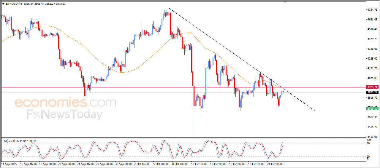 The price of (ETHUSD) declined slightly in its last intraday trading, affected by reaching the resistance of its EMA50, putting it under the negative pressure, accompanied by testing main bearish trendline on the short-term basis, intensifying the negative pressure, besides the relative strength indicators reaching exaggerated overbought levels compared to the price movement, indicating the weakness of the surrounded bullish momentum in its early trading.
