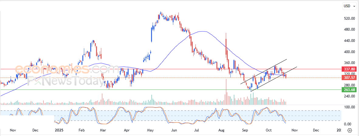 Dogecoin (DOGEUSDT) declined in its latest intraday trading under continued negative pressure from trading below the 50-day SMA, remaining under the dominance of the main short-term bearish trend with trading along a descending line that reinforces this direction. In addition, bearish signals are appearing from the relative strength indicators after previously reaching extremely overbought levels.