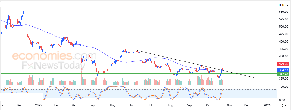 Therefore, as long as the stock remains below the resistance level of $373.75, our outlook leans toward a decline in its upcoming movements, targeting the support level of $342.40.