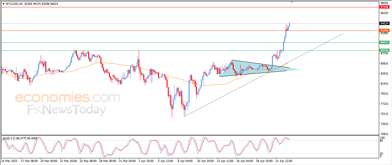 Bitcoin price kept declining in its last intraday trading, to successfully breach the resistance level at $92,500,amid the dominance of the main bullish trend on the short term basis, and its trading alongside trend line, the price last rise came in spite of the emergence of the negative signals from the (RSI), in attempt to offload some of its overbought conditions, which shows the strength of the positive momentum strength.