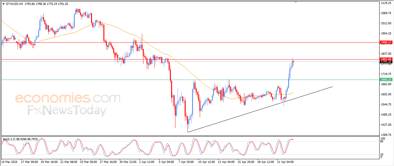 Ethereum price (ETHUSD) settled upside in its last intraday trading, attempting to gain the required positive momentum to help it to breach its current resistance at $1,800, as it attempts to offload some of its overbought conditions on the (RSI), with the beginning of negative overlapping signals appearance, amid the dominance of the bullish correctional trend on the short-term basis.