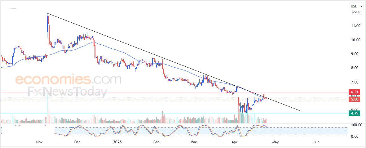 Therefore we expect the price to decline and target the support of $4.80, provided the resistance of $6.30 holds on.