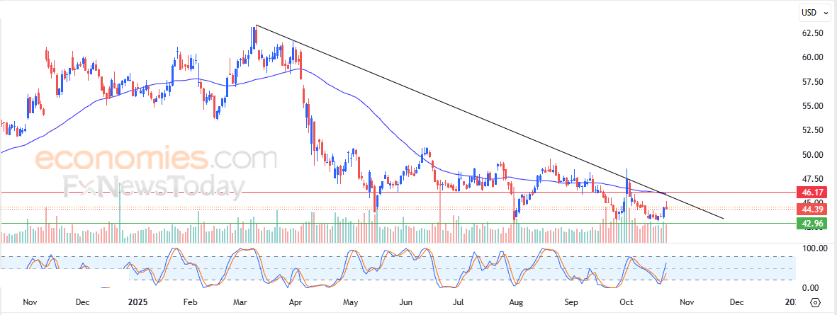 Therefore, we expect the stock to decline in its upcoming trading sessions as long as the resistance level of $46.17 holds, targeting the key support level of $42.95.