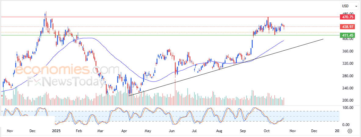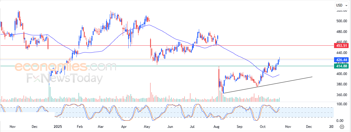 Therefore, we expect the stock to rise in its upcoming trading sessions, especially as long as it remains above $414.85, targeting the resistance level of $453.50.