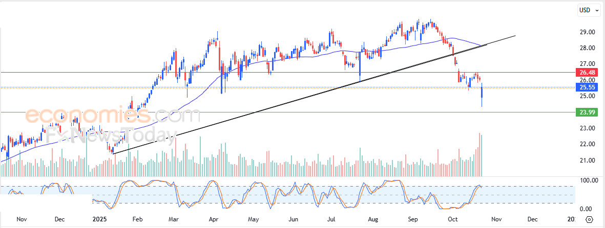 Therefore, we expect the stock to decline in its upcoming trading sessions as long as the resistance level of $26.50 holds, targeting the support level of $24.00.