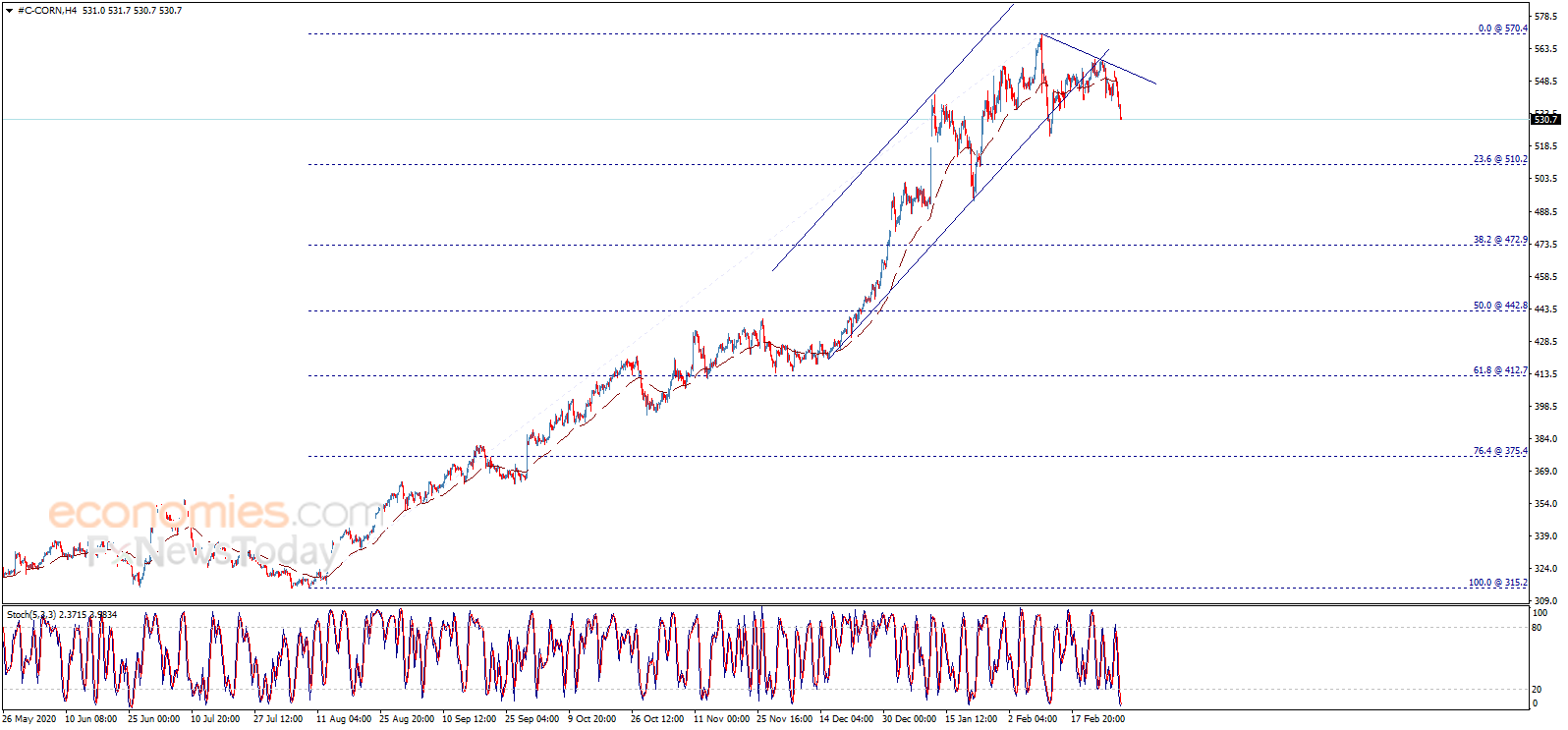 Corn price trades with clear negativity since yesterday, starting today with additional decline to approach our first waited target at 525.00, reinforcing the expectations of continuing the bearish trend, which its next target extends to 510.00.