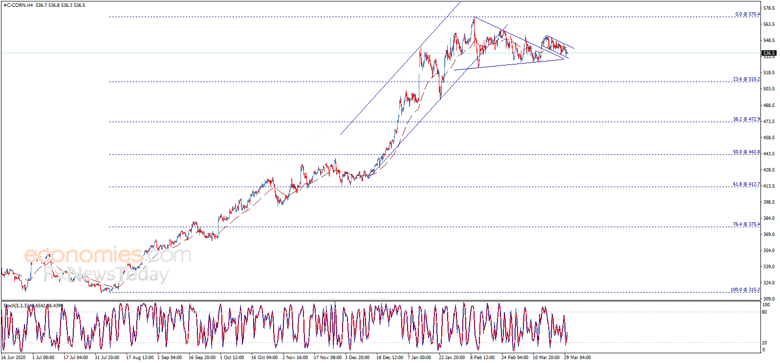 Corn price provided negative trades yesterday to test the minor support 533.50, noticing that stochastic begins to provide positive signals now, waiting to motivate the price to resume the expected bullish trend for the upcoming period, which targets 570.40 as a next main station.