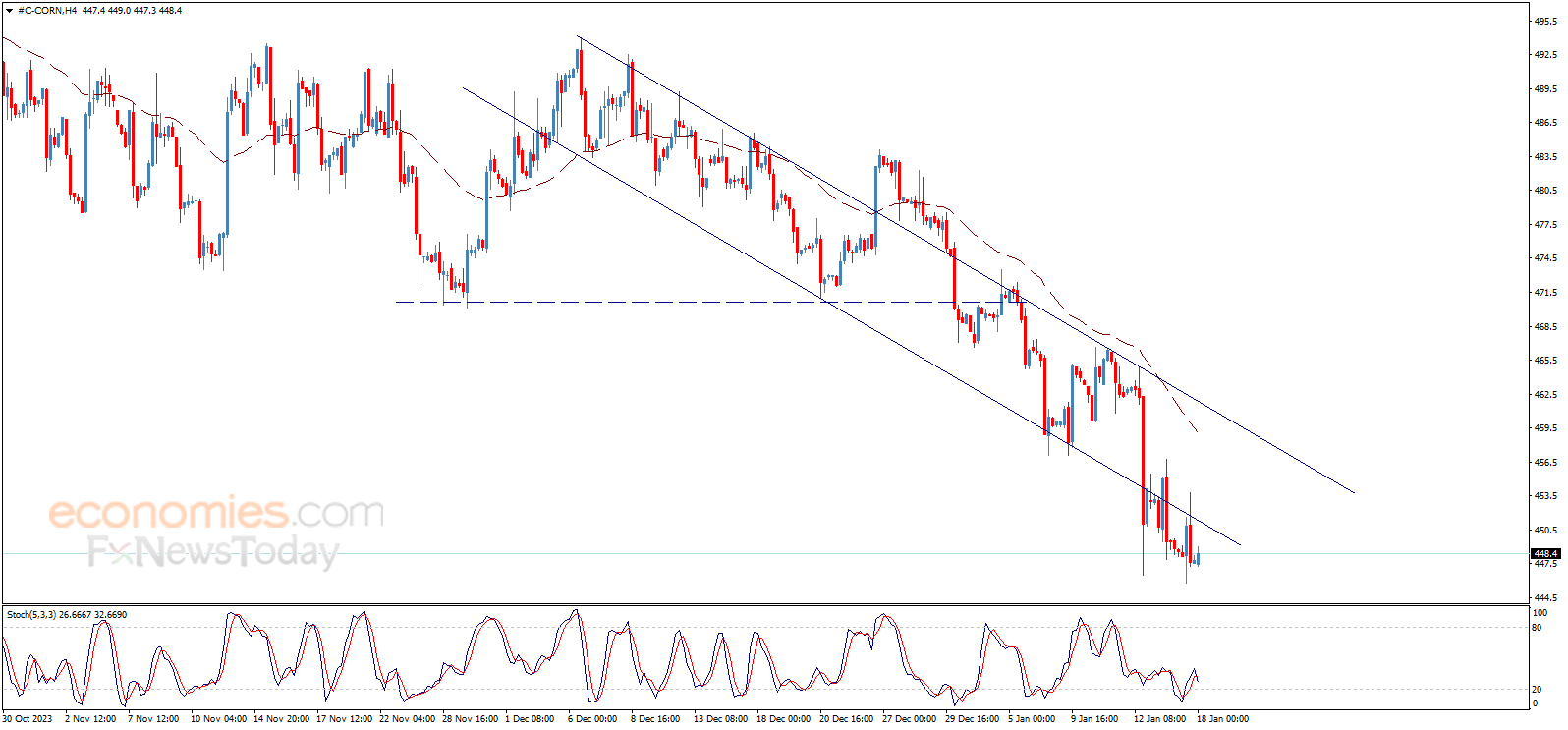 Corn price attempted to breach 452.50 level but it bounced bearishly to keep its stability below it, which keeps the bearish trend scenario valid and active for the upcoming period, supported by the negative pressure formed by the EMA50, noting that our waited target reaches 440.00.