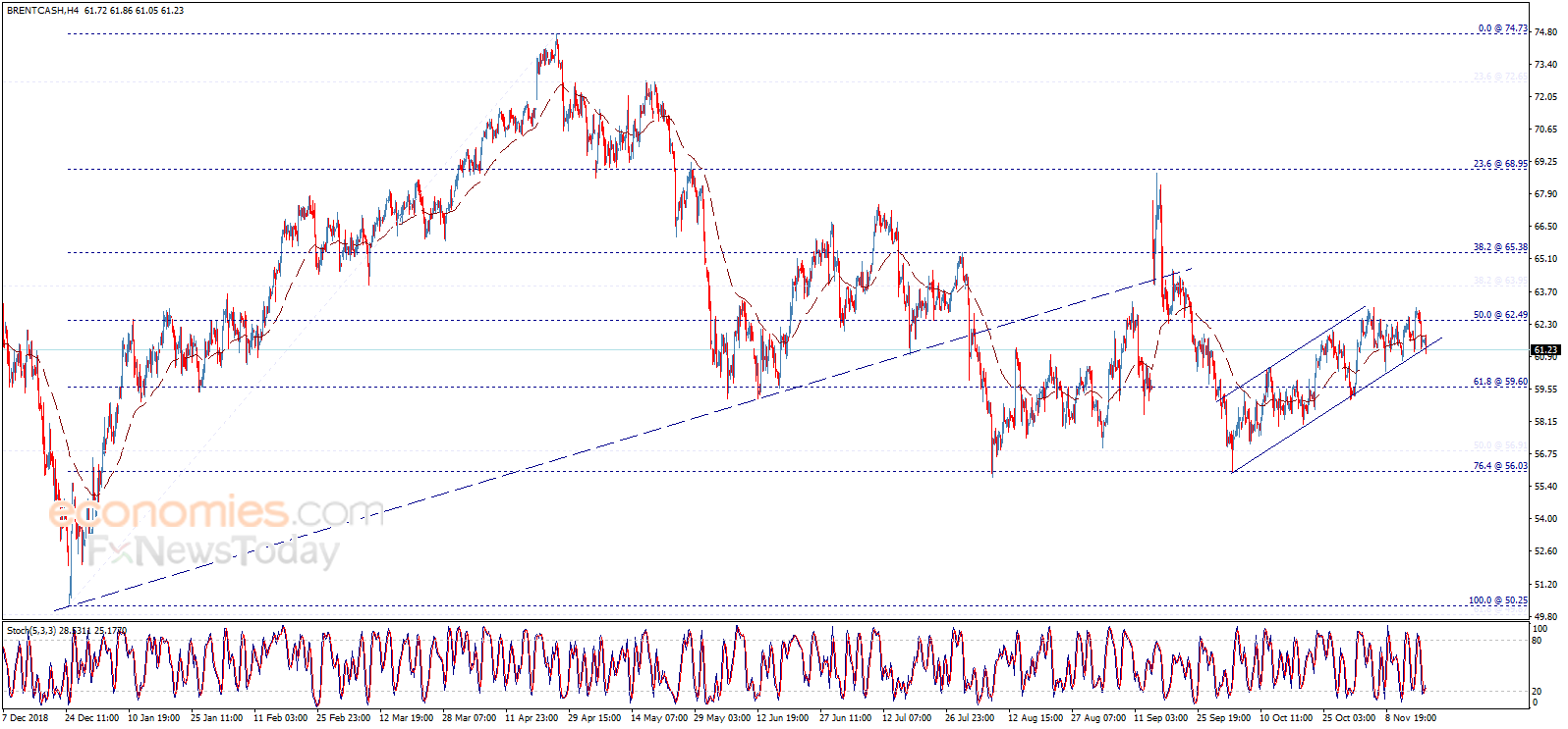 Brent oil price shows new bearish bias to attack 61.20 support line and attempts to hold below it, which hints the price hed to turn to decline in the upcoming sessions, but we need to get a daily close below the mentioned level to confirm the continuation of the bearish bias towards 59.60 as a next negative target.