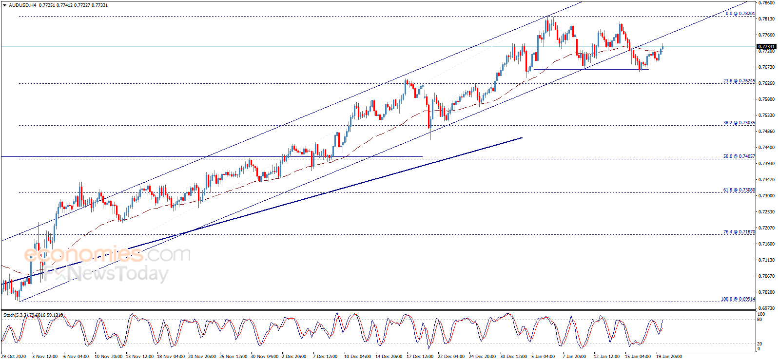The AUDUSD pair trades with new positivity to approach 0.7760 level, and as we mentioned this morning, the price needs to hold below this level to keep the bearish trend active for today, which targets 0.7665 followed by 0.7625 levels mainly, noting that breaching 0.7760 will stop the expected decline and push the price to resume the main bullish trend again.