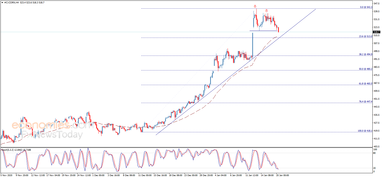 Corn price begins breaking 520.10 level and moves below it now, to activate the negative effect of the double top pattern and gets negative motive that supports the expectations of achieving correctional targets that start at 513.00 and extend to 494.90, to continue suggesting the bearish trend in the upcoming sessions conditioned by the price stability below 535.40 and 542.30 levels.