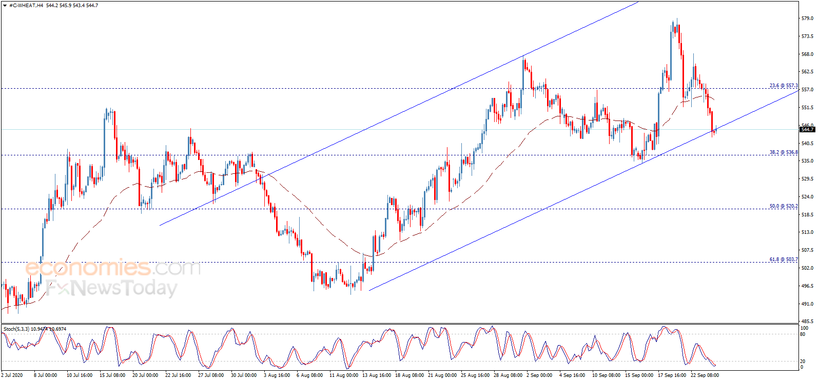 Wheat price managed to break the bullish channel’s support and settles below it now, which supports the continuation of the expected bearish trend scenario on the intraday and short term basis, targeting 536.80 level as a next main station, being aware that the failure to settle below 545.00 will push the price to achieve intraday gains that target testing 557.30 level initially.