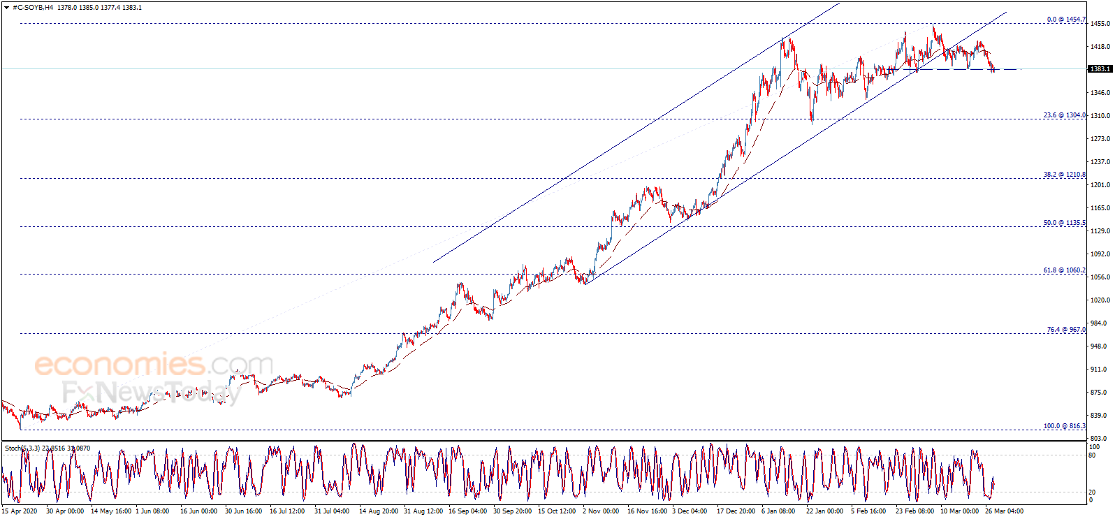 Soybean price attempts to break the horizontal support line that appears on the chart, to support the continuation of our bearish overview, waiting to touch 1375.00 level initially, which breaking it represents the key to rally towards 1304.00 as a next main station, reminding you that the continuation of the expected decline requires holding below 1420.00.