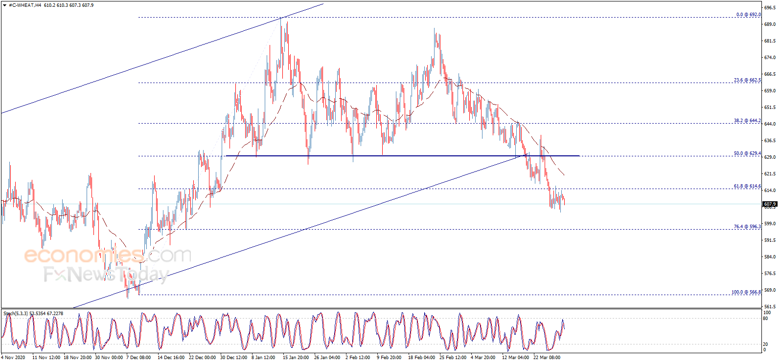 Wheat price resumes its negative trades to move away from 614.60 level, reinforcing the expectations of continuing the bearish trend on the intraday basis, which targets 596.30 as a next station, noting that surpassing this level will push the price to 566.80 on the near term basis, while the expected decline will remain valid conditioned by the price stability below 614.60.