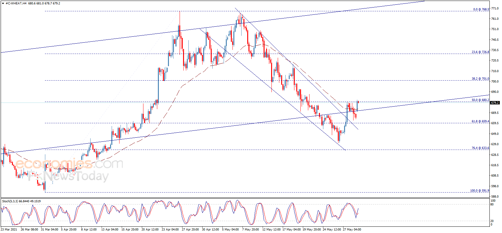 Wheat price opened today’s trading with a strong positivity to test the critical resistance at 680.20, noticing that the price remains below this level, which keeps the bearish trend scenario active in the upcoming period, targeting 659.40 then 633.60 mainly.