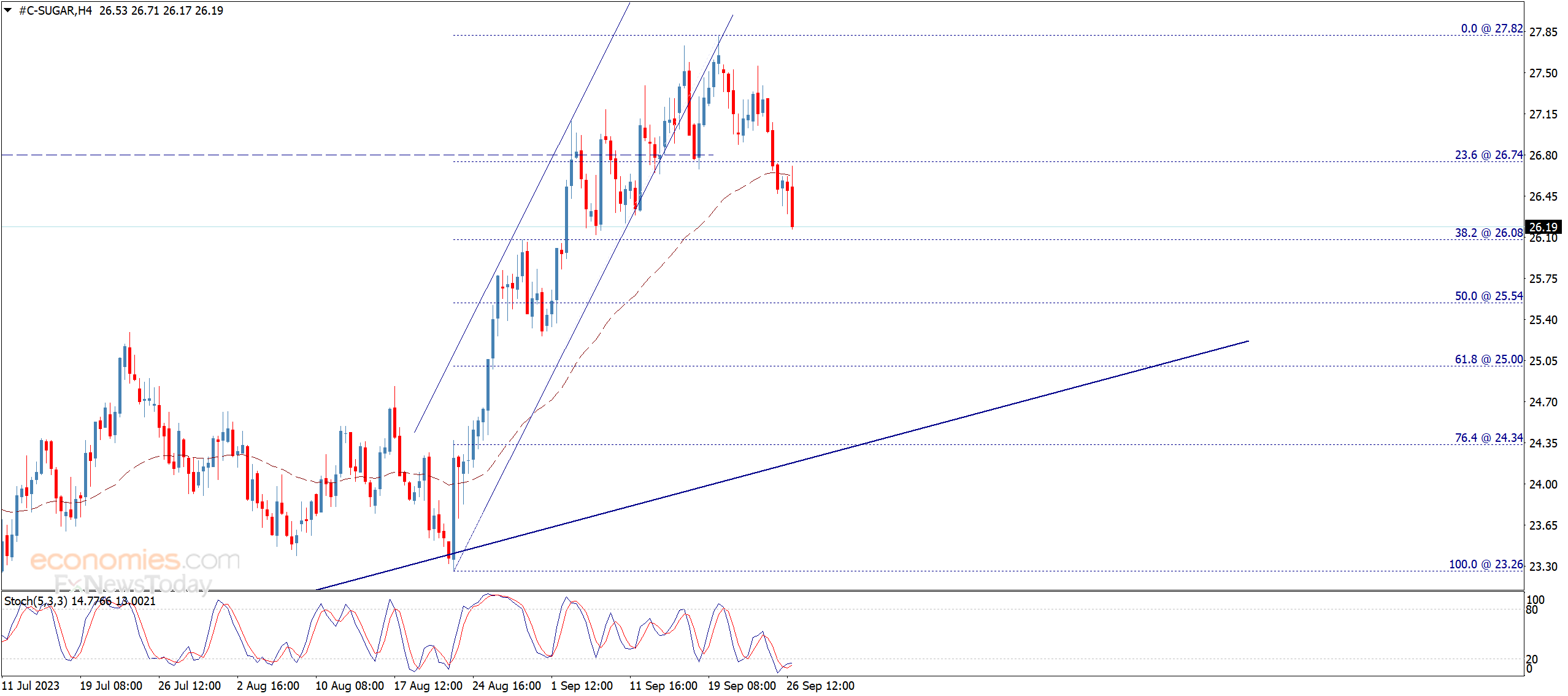 Sugar price traded with strong negativity yesterday to reach the thresholds of the waited target at 26.08, and we expect to surpass this level to achieve more bearish correction that its next target reaches 25.55.