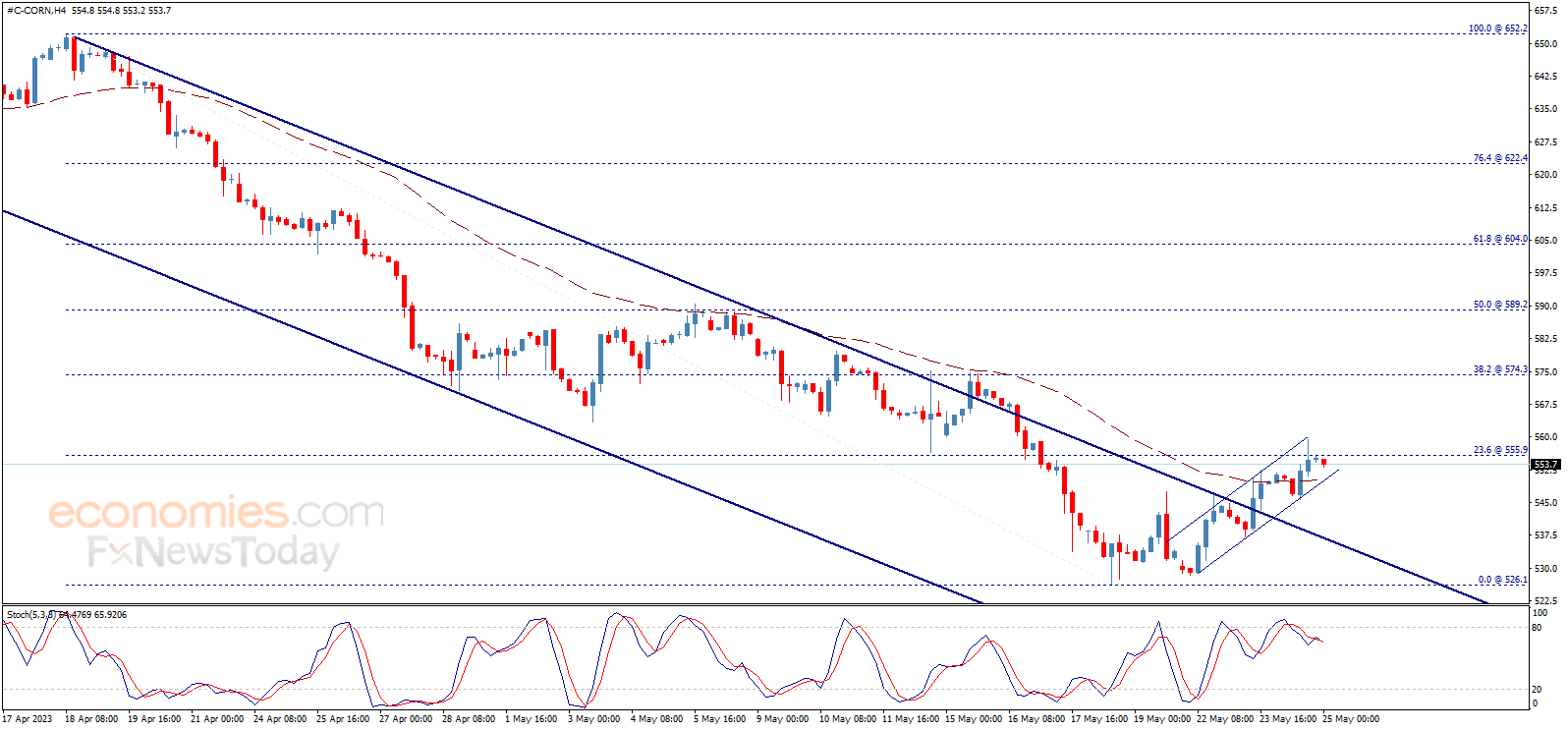 Corn price managed to touch our first suggested target at 555.90 and faces solid resistance there, affected by stochastic negativity that hinders the mission to rise, which makes us prefer to stay aside until we get clearer signal for the next trend, which we will get through breaching 555.90 resistance or breaking 550.00 support.