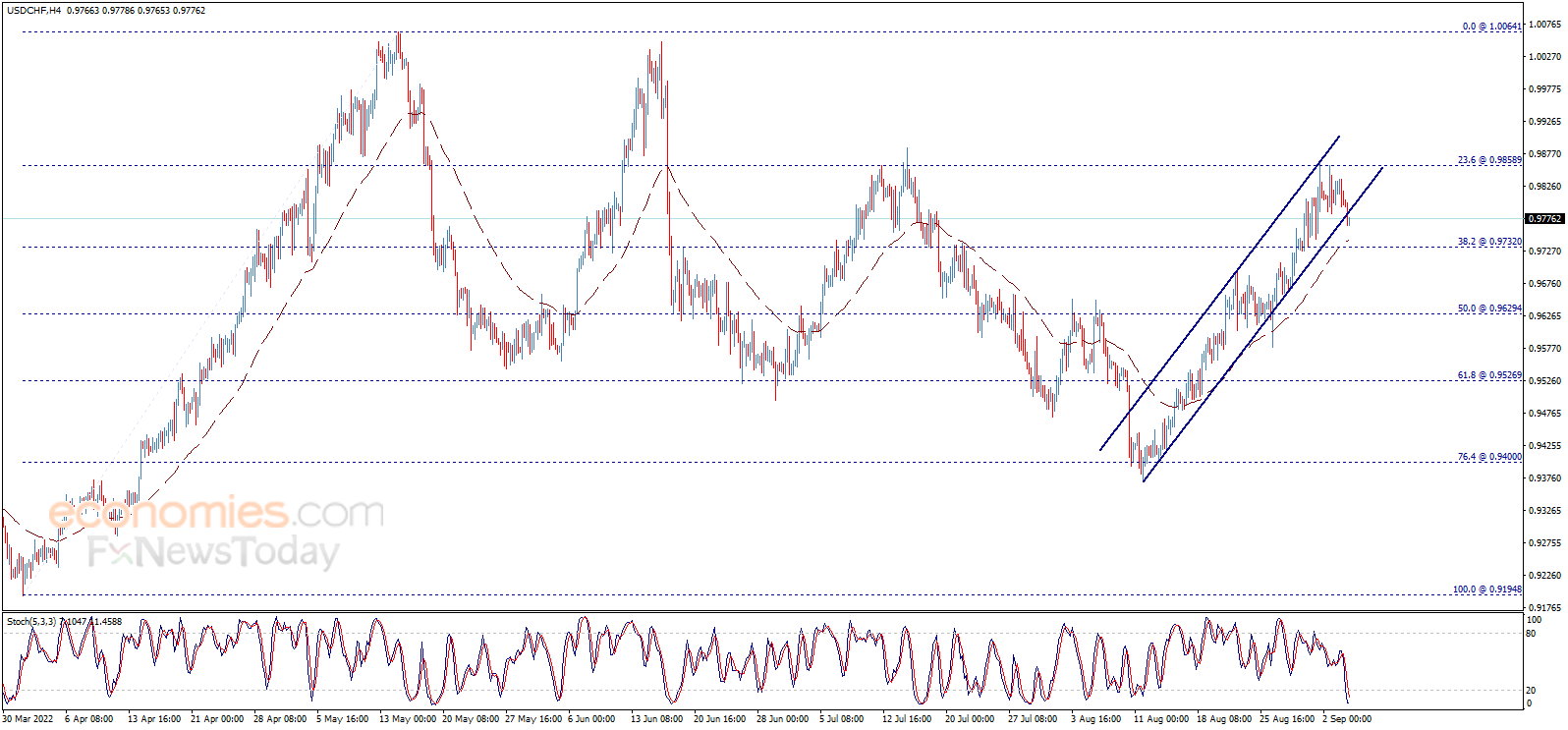 The USDCHF pair trades negatively now to break the bullish channel’s support line and settles below it, which puts the price under expected negative pressure on the intraday basis, targeting visiting 0.9730 mainly.