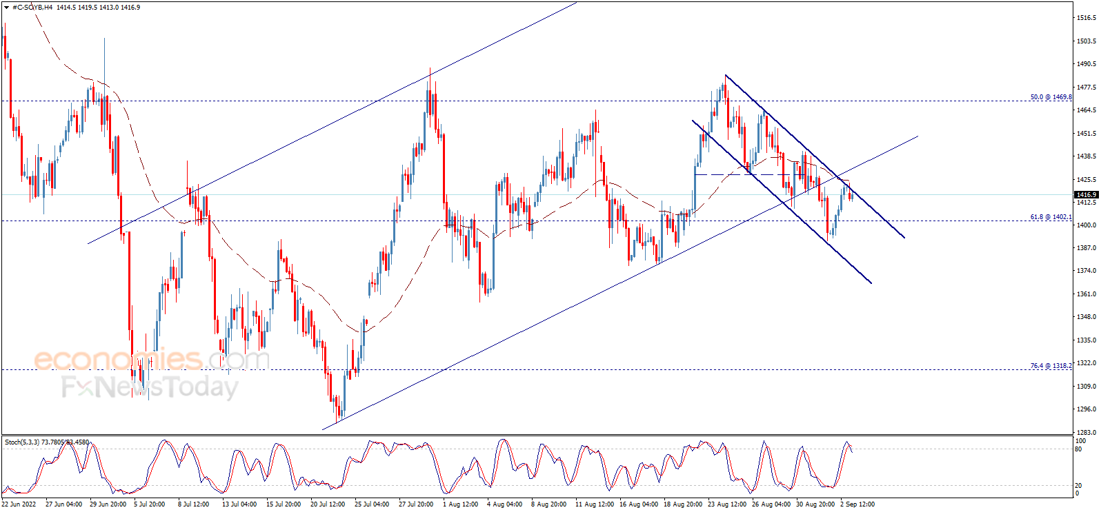 Soybean price provided positive trades to test the bearish channel’s resistance that appears on the chart, and the EMA50 meets this resistance to add more strength to it, while stochastic shows clear negative signals now.