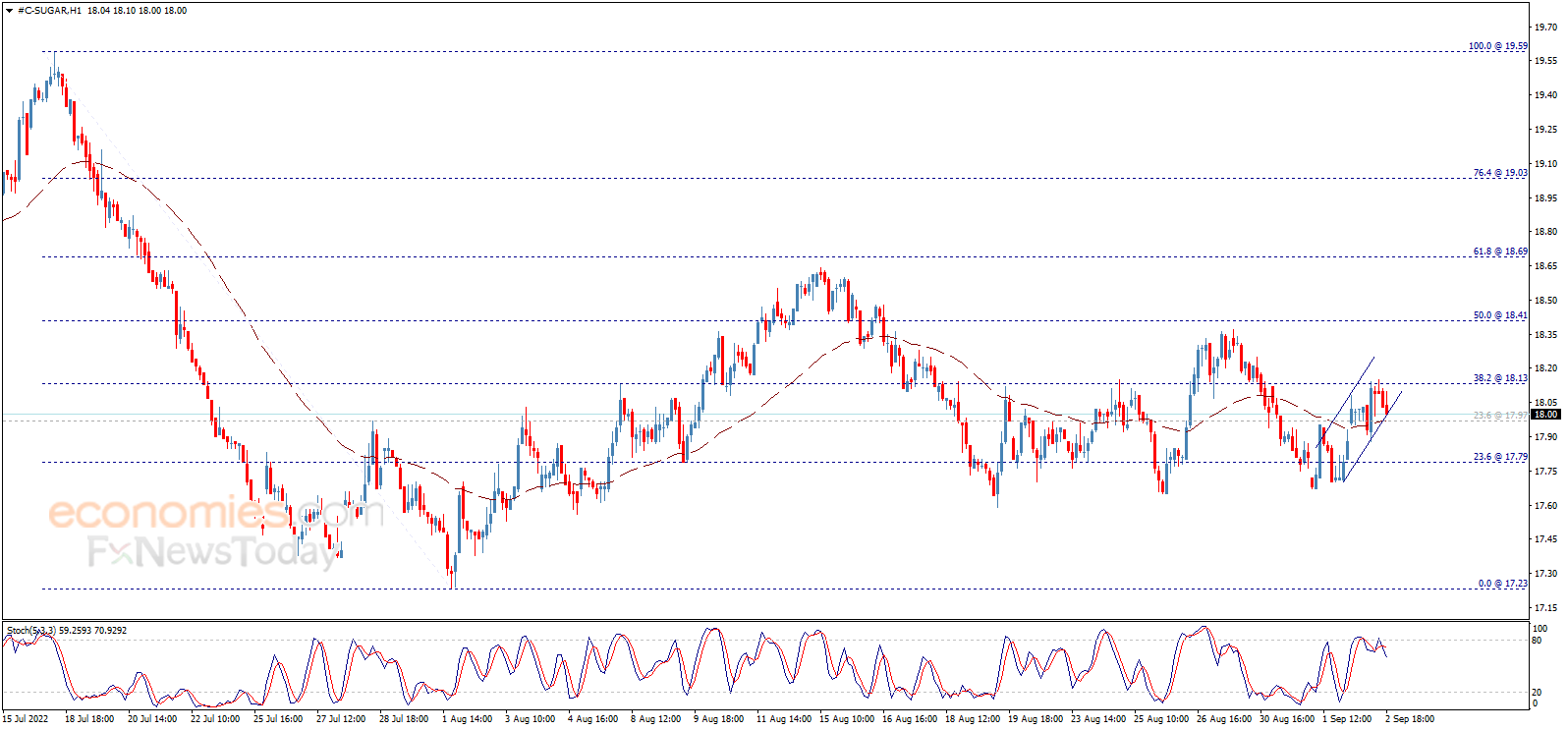 Sugar price bounced bearishly after testing 18.13 level in the previous sessions, pressing on the intraday bullish channel’s support line that appears on the chart, which we believe it forms bearish flag pattern that supports the chances of continuing the expected bearish trend for the upcoming period.