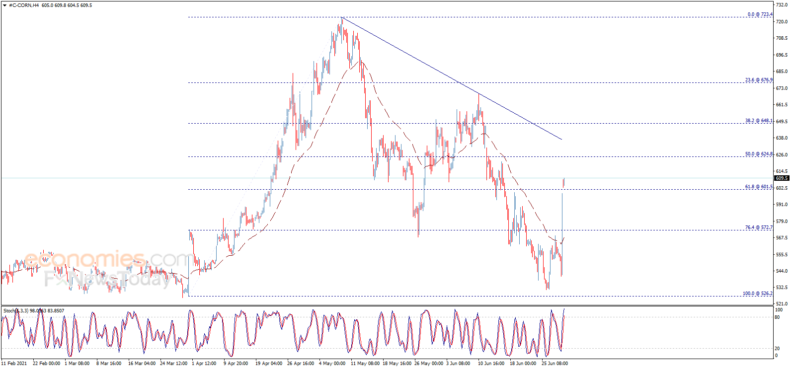 Corn price rallied upwards sharply yesterday to surpass 572.70 and settles above 600.00 barrier now, which leads the price to achieve more expected gains in the upcoming period, on its way to visit 624.80 level as a next positive target.