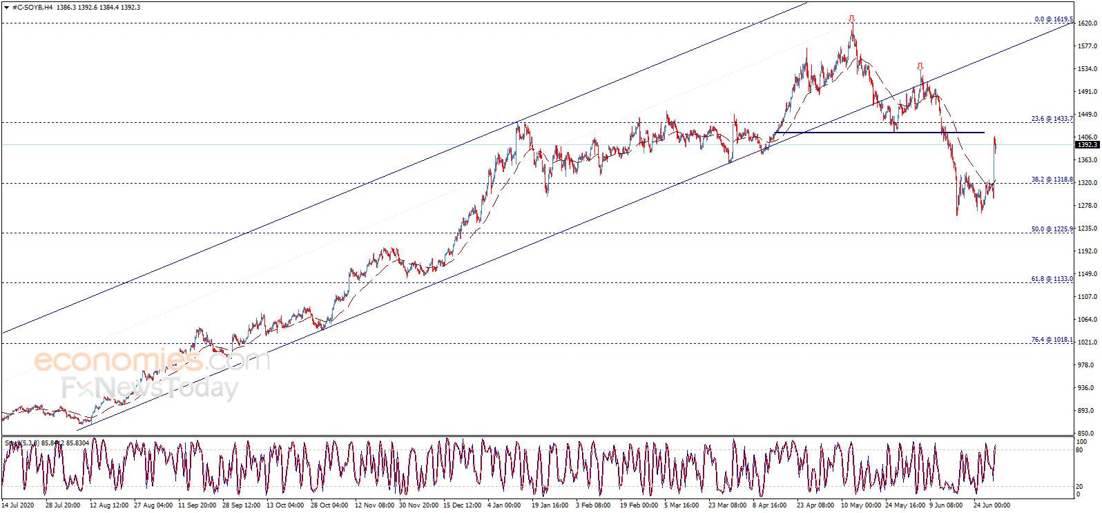 Soybean price soared yesterday to breach 1318.80 level and test 1400.00 barrier, to head towards achieving more expected rise and return to the main bullish track again, noting that the expected targets begin at 1433.70.