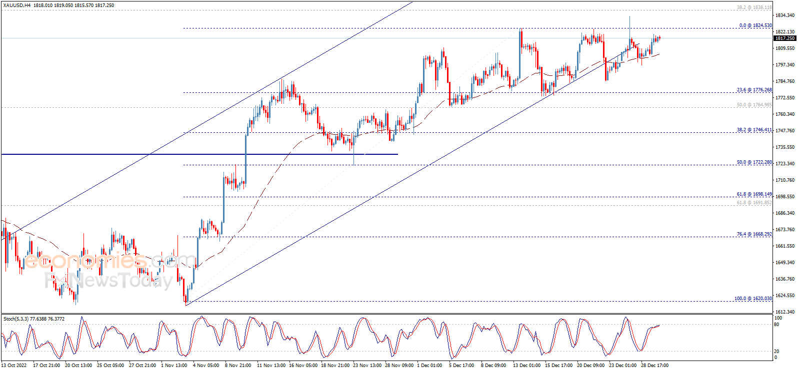 Gold price crawls upwards to approach the first waited target at 1824.50, and we suggest breaching this level to achieve additional gains that reach 1850.00, to keep the bullish trend scenario valid and active for the upcoming period supported by the EMA50, reminding you that it is important to hold above 1802.00 to continue the expected rise.