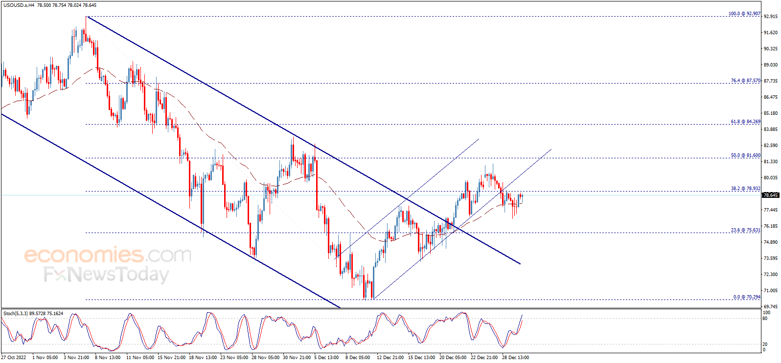 Crude oil price trades positively to test the key resistance 78.93, and as we mentioned yesterday, the price needs to consolidate below this level to keep the bearish trend scenario active, which targets 75.63 level as a next main station, noting that breaching 78.93 will stop the bearish trend and lead the price to recover again.