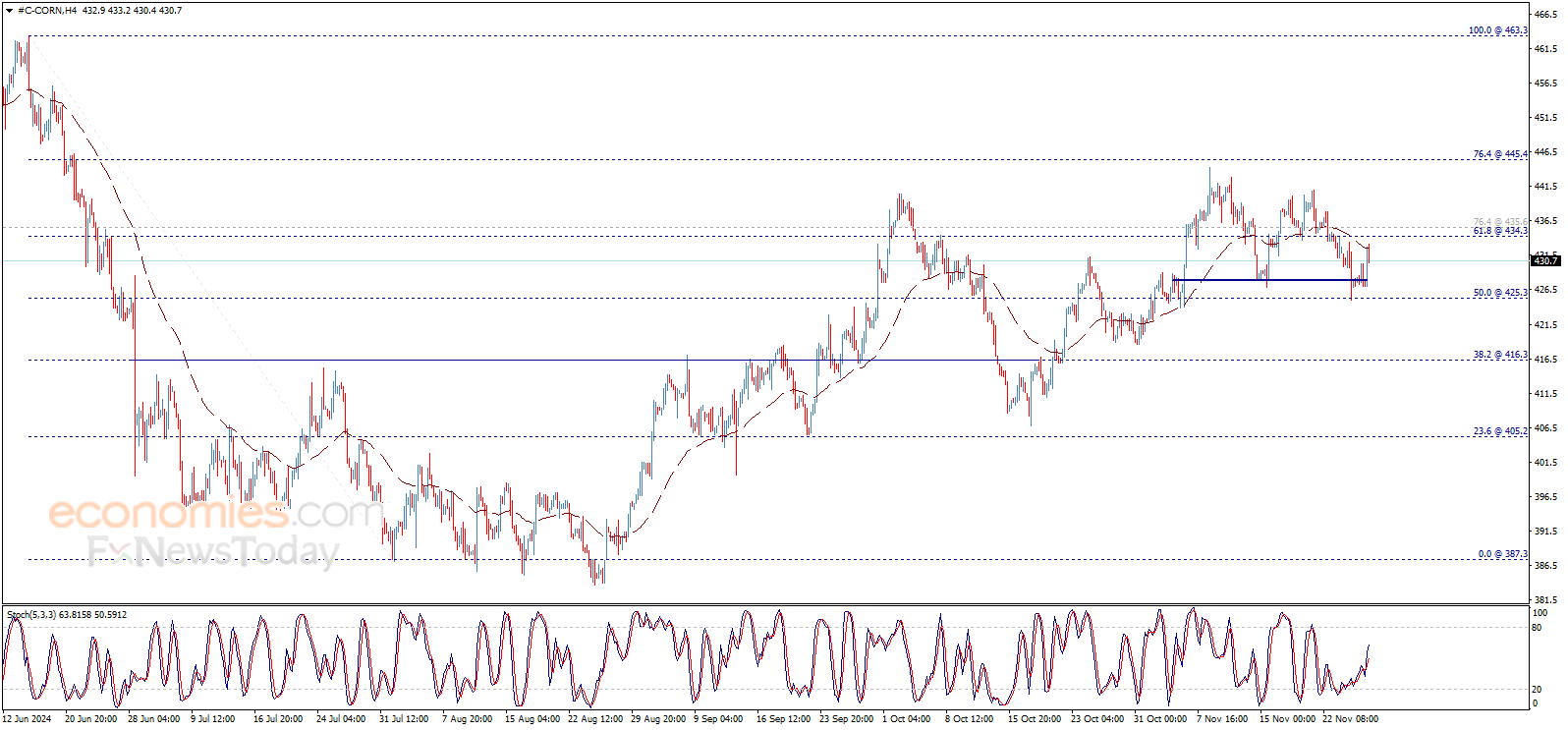 Corn price traded with clear positivity in the previous sessions to approach the key resistance 434.30, noticing that the EMA50 formed good resistance against the price, while stochastic loses its positive momentum clearly.