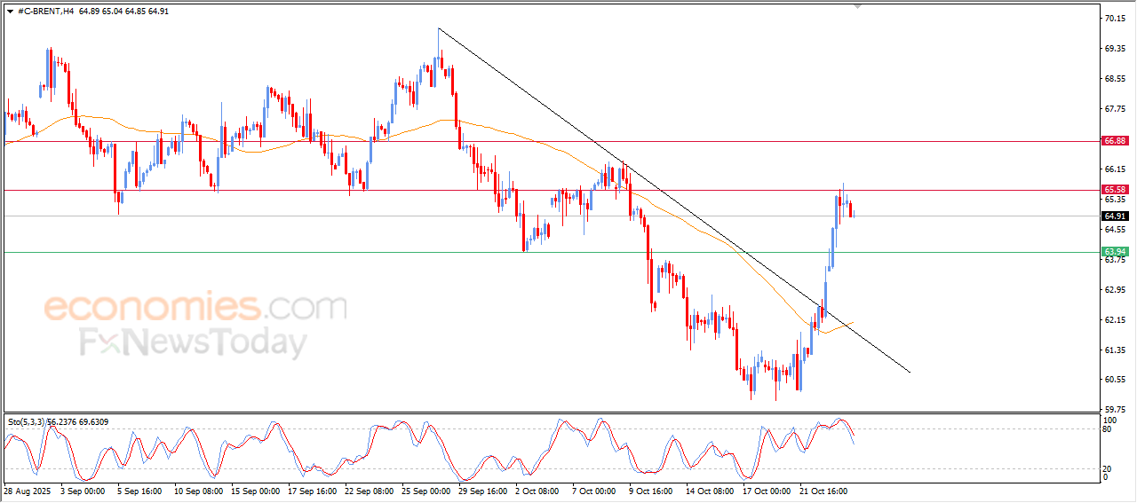 The (Brent) price declined during its last intraday trading, amid the dominance of strong bullish corrective wave on the short-term basis, supported by its continuous trading above its EMA50, attempting to gain bullish momentum that might help it to recover and rise again, and attempts to offload its overbought condition on the relative strength indicators, especially with the emergence of the negative signals from them.