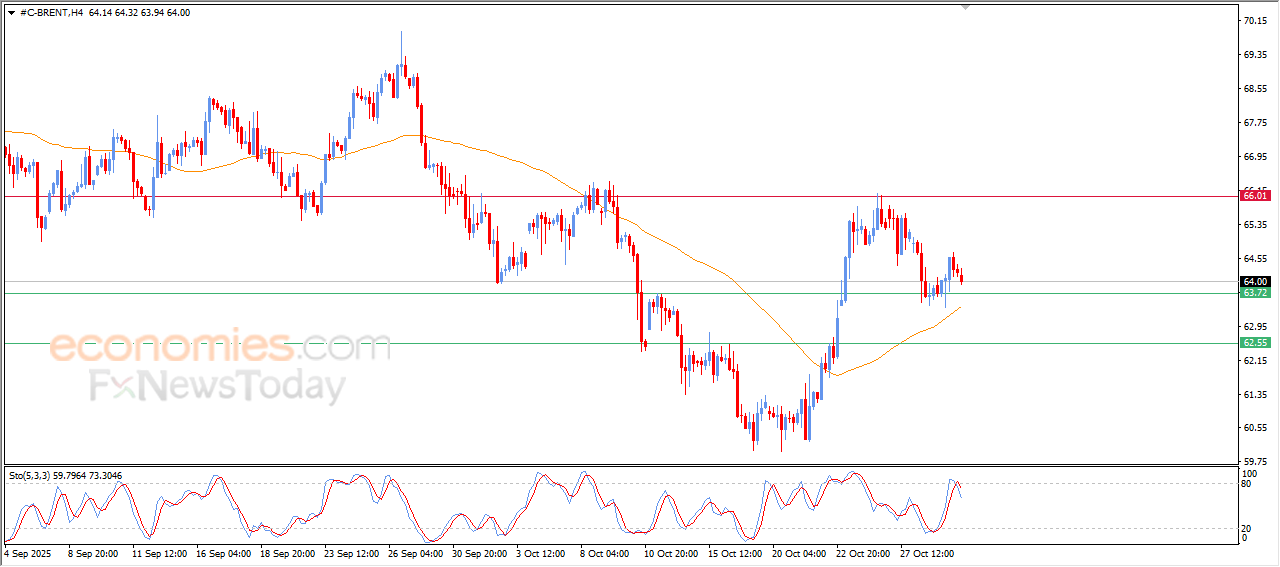 The (Brent) price decline in its last intraday trading, in an attempt to gain bullish momentum that might help it recover and rise again, and attempts to offload its overbought conditions on the relative strength indicators, especially with the emergence of the negative signals from there, amid the dominance of bullish corrective wave on the short-term basis, taking advantage of the dynamic support that is represented by its trading above EMA50, reinforcing the chances of its recovery in the upcoming period.