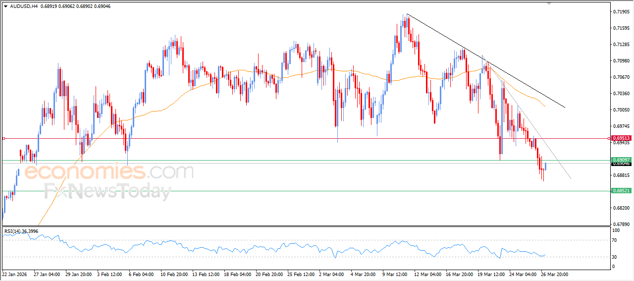 The AUDUSD pair showed a cautious rebound in recent intraday trading after breaking below the key support level at 0.6910, which had been a target in our previous analysis. This upward move appears to be an attempt to recover part of the earlier losses, while also easing oversold conditions on the relative strength indicators, supported by emerging positive signals. Despite this temporary recovery, the short-term corrective bearish trend remains dominant, with price moving alongside steep main and minor downward trendlines, reinforcing the strength of the bearish bias.