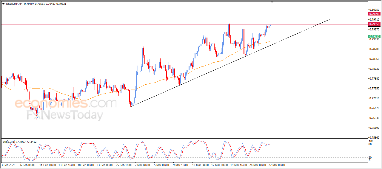 The USDCHF pair advanced during recent intraday trading, testing the key resistance level at 0.7955, which had been a previous target in our analysis. The pair remains supported by the short-term uptrend, moving along a minor ascending trendline and staying above EMA50, providing dynamic support that increases the likelihood of breaking this resistance. After offloading some of the overbought conditions on the relative strength indicators, opening the way for targeting new resistance levels.