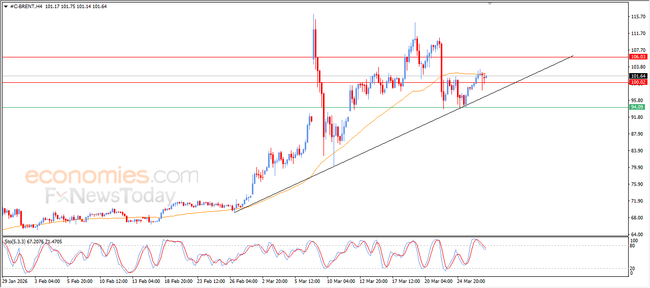 Brent Crude Oil fluctuated on its last intraday level, attempting to gain positive momentum to surpass the stubborn negative pressure of EMA50. The price is also trying to ease its overbought conditions on the relative strength indicators, despite some negative signals emerging, while the short-term bullish trend remains dominant, guided by an ascending trendline that reinforces the strength of this path.