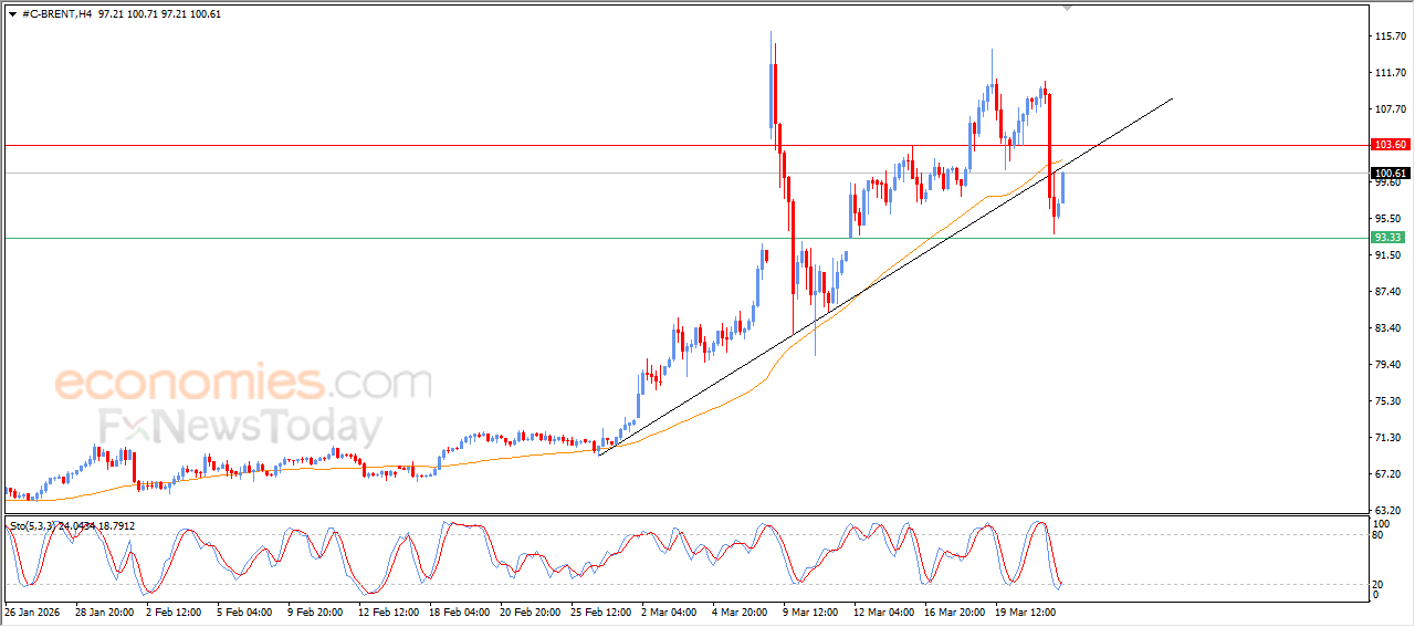 Brent crude oil rose in its last trading on the intraday levels, attempting to recover some of its previous losses, attempting to offload its clear oversold conditions on the relative strength indicators, especially with the emergence of positive overlapping signals, to retest a main bullish trend line – that was broken by its sharp decline yesterday- accompanied by reaching EMA50’s resistance, which intensifies the surrounding negative pressure.