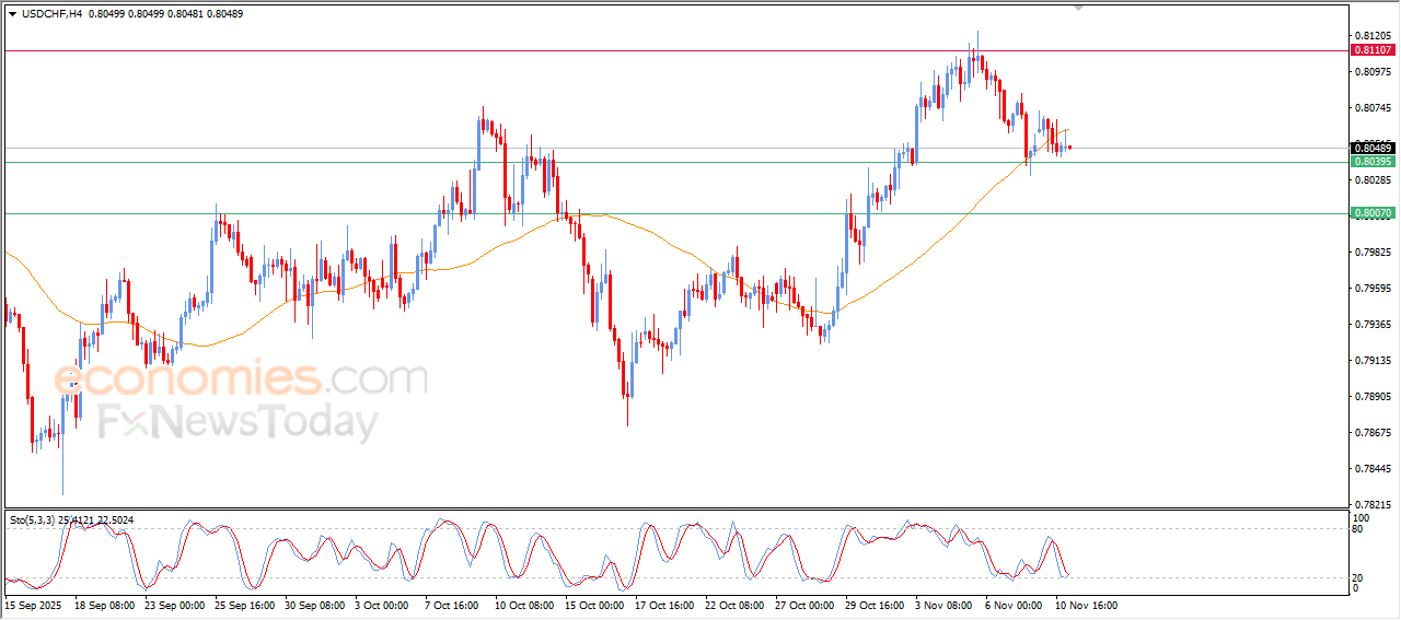 The (USDCHF) price settled lower in its last intraday trading, amid the dominance of the strong bearish corrective wave on a short-term basis, and there is negative pressure due to its trading below EMA50, intensifying the negative pressure, especially with the emergence of the negative signals on the relative strength indicators, despite reaching oversold levels.